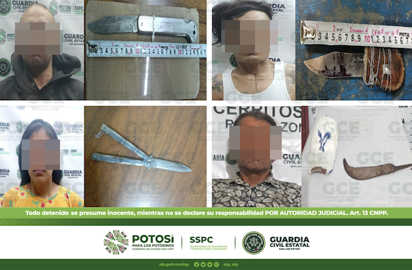 En la capital, una de las detenciones fue en las calles de Oro y Sulfato en la colonia Morales; ahí fue detenido Rodolfo de 34 años después de que se le asegurara un cuchillo de aproximadamente 16 centímetros. En el municipio de Soledad de Graciano Sánchez, dos individuos fueron detenidos, el primero de ellos en la calle de Melchor Ocampo en la colonia Fracción Rivera, tratándose de José de 25 años a quien se le aseguró una navaja de 25 centímetros; en la colonia Villa de Cactus, Felicia de 23 años quedó detenida después de que la GCE le asegurara una navaja de 20 centímetros.