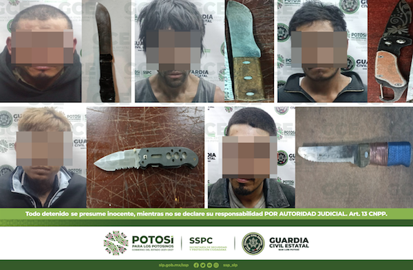 Una de las detenciones fue en la zona centro de esta ciudad capital, a la altura de la avenida Venustiano Carranza, donde Juan de 30 años de edad resultó detenido tras asegurarle un cuchillo de 17 centímetros; también, en las calles Mecánica y Turismo en la colonia Valle del Tecnológico, José de 35 años fue detenido al asegurarle un cuchillo de 31 centímetros.