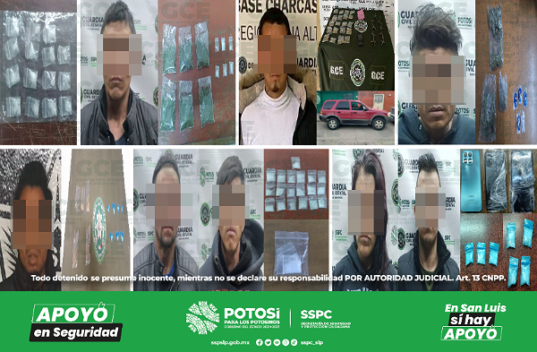 S.L.P.- En el marco de las acciones de la Guardia Civil Estatal en todo el Estado de San Luis Potosí, se logró la detención de nueve presuntos narcomenudistas y el aseguramiento de casi 100 dosis de droga.