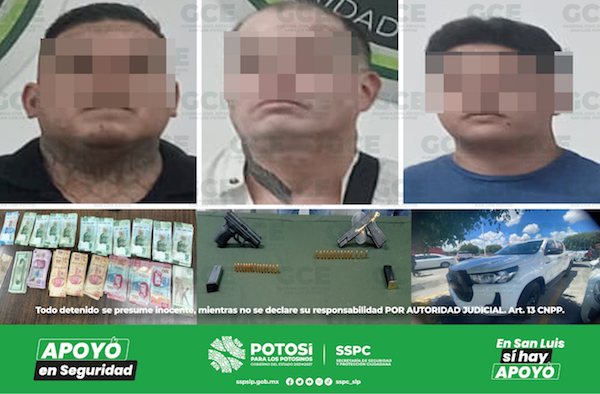 San Luis Potosí, S.L.P.- Tras un reporte ciudadano atendido en la Línea de Emergencias 911, sobre la presencia de personas sospechosas a las afueras de un cajero automático ubicado en la colonia El Paseo, en la capital potosina, agentes de la Guardia Civil Estatal (GCE) detuvieron a tres presuntos integrantes de una célula criminal y se les aseguró armamento y dinero en efectivo.
