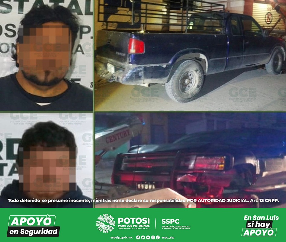 San Luis Potosí.- Como resultado de las acciones para combatir hechos que puedan poner en peligro la integridad de las familias potosinas, dos hombres fueron detenidos por elementos de la Guardia Civil Estatal (GCE) por presuntos delitos contra la seguridad de tránsito.