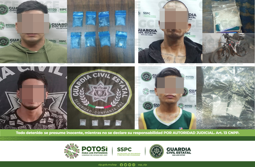 S.L.P.- Mediante los diferentes dispositivos de seguridad y vigilancia, encaminados a preservar la paz pública, oficiales de la Guardia Civil Estatal (GCE) efectuaron la detención de cuatro hombres por presunta posesión de estupefacientes.