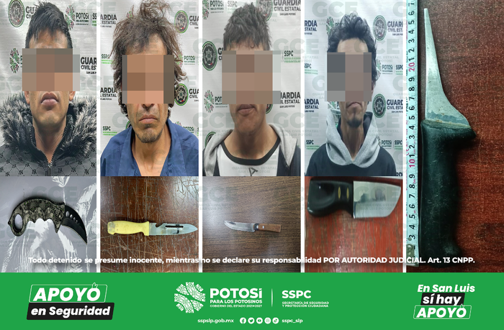 San Luis Potosí, S.L.P.- En el marco de las acciones de seguridad y vigilancia, efectuadas en diferentes puntos de esta ciudad capital, cuatro hombres y un menor de edad fueron detenidos por la Guardia Civil Estatal (GCE) por presunta portación de armas punzocortantes.