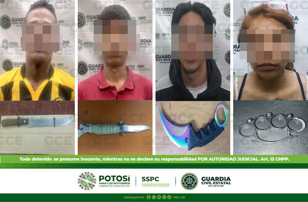 San Luis Potosí, S.L.P.- Como parte de los operativos de seguridad y vigilancia, efectuados por las diferentes colonias de la capital potosina, oficiales de la Guardia Civil Estatal (GCE) detuvieron a cuatro hombres por el probable delito de portación de armas prohibidas.