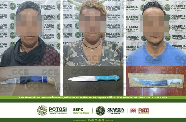 En otro hecho, Ana “N” de 35 años, fue detenida en la avenida Estrella de la colonia Del Llano, cuando presuntamente se desplazaba con un cuchillo y al continuar con las labores preventivas, se detuvo a Daniel “N” de 35 años en la calle de Purísima del Barrio de Tlaxcala, al asegurársele un cuchillo.