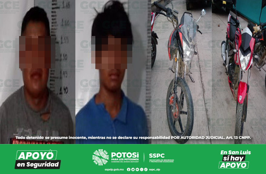 Los hechos fueron durante los patrullajes de seguridad emitidos en la carretera estatal San Martín Chalchicuautla-Tamazunchale, en La Providencia, ahí fueron detenidos Juan “N” de 25 años de edad y Jorge “N” de 19 años, quienes se desplazaban a bordo de dos motocicletas: una de ellas marca Italika, modelo 2023, color rojo con negro, sin placa y una motocicleta marca Vento, color negro, sin placa.