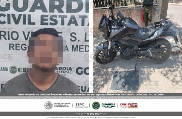 Uno de los sucesos tuvo lugar en el municipio de Rioverde, sobre la colonia Victoria, ahí fue detenido Luis “N” de 29 años de edad, quien circulaba a bordo de una motocicleta sin placa, misma que presentó además alteraciones en sus números confidenciales, tanto del motor como el número de serie, lo que derivó a su arresto.