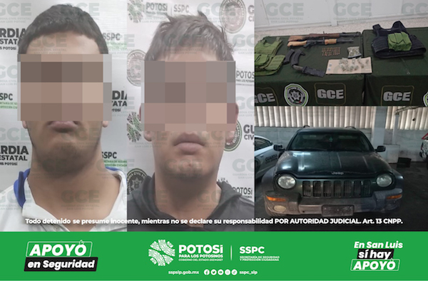 San Luis Potosí, S.L.P.- Tras el seguimiento a un reporte atendido en el Sistema de Emergencias 911 sobre un probable hecho de privación ilegal de la libertad, agentes de la Guardia Civil Estatal (GCE) acudieron al lugar de los hechos y detuvieron a dos presuntos criminales con armamento, equipo táctico y droga.