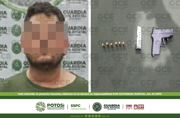 Soledad de Graciano Sánchez, S.L.P.- Como resultado las acciones de la Guardia Civil Estatal (GCE), para inhibir hechos delictivos de agresión y violencia familiar, un hombre fue detenido a petición de su cónyuge, además de asegurarle una pistola al momento de su arresto.