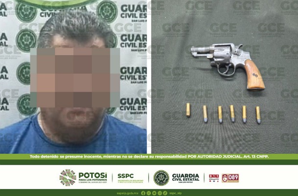 San Luis Potosí, S.L.P.- Labores operativas de la Guardia Civil Estatal (GCE) desarrolladas para preservar la paz en el Estado, permitieron la detención de un hombre, por los probables delitos de lesiones y portación de un arma de fuego, en agravio de su vecino.