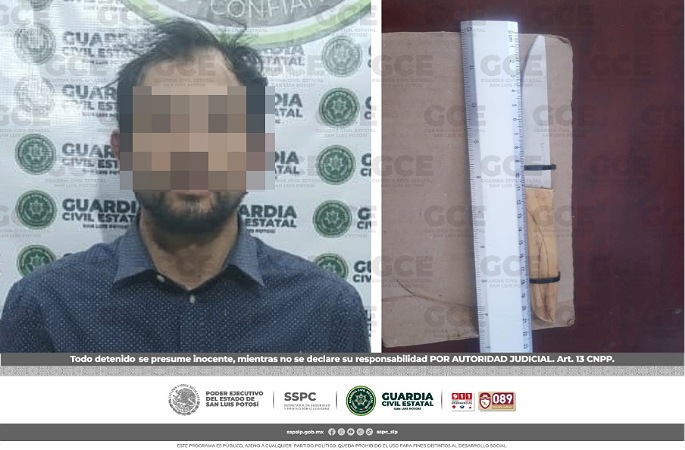 San Luis Potosí, S.L.P.- Acciones preventivas de la Guardia Civil Estatal en la capital potosina, permitieron la detención de un hombre que presuntamente llevaba consigo un cuchillo.