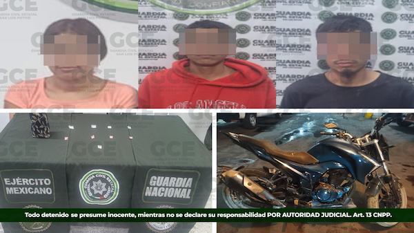 Al continuar con las labores de seguridad, en el municipio de Villa de Arriaga, la Guardia Civil Estatal, como parte del dispositivo Base de Operaciones Mixtas Interinstituacional (BOMI), detuvo a Francisco “N” de 20 años, Juan “N” de 25 años, Brenda “N” de 30 años y a una menor de 16 años de edad.