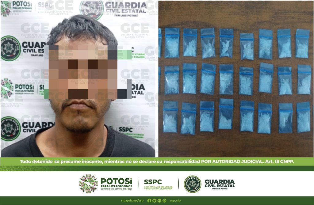 San Luis Potosí, S.L.P.- Como resultado de los operativos implementados dentro del Plan Integral de Seguridad, agentes de Guardia Civil Estatal (GCE) detuvieron a un objetivo criminal en la capital potosina, tras asegurarle 30 dosis de la droga sintética conocida como “cristal”.