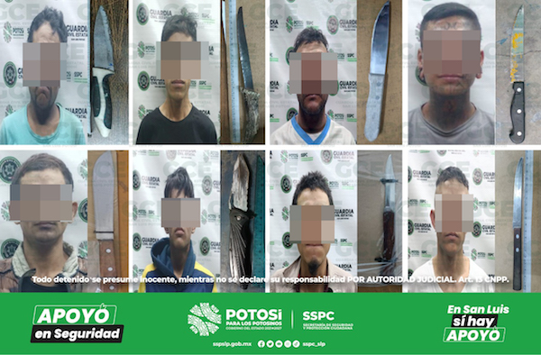 S.L.P.- Gracias a los operativos de seguridad y prevención que realizan los elementos de la Guardia Civil Estatal en todo el territorio potosino, se detuvo a ocho personas que llevaban consigo armas prohibidas.