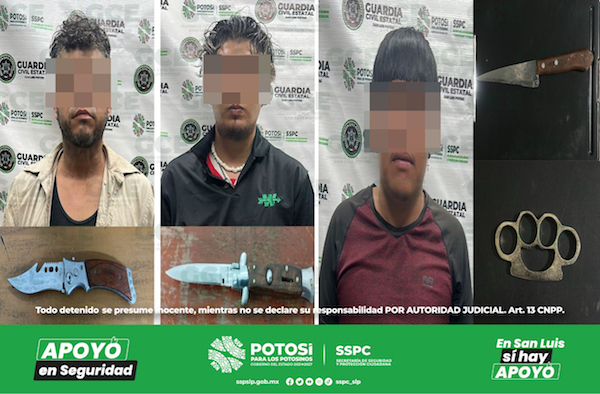 El primer suceso fue en la colonia Niños Héroes, autoridades estatales detuvieron a Diego “N” de 21 años de edad, a quien se le aseguró una navaja; en la misma zona se ubicó a Othnel “N” de 21 años, capturado con una navaja; en la colonia Los Magueyes, Ángel “N” de 23 años fue sorprendido con un cuchillo de 21 centímetros.