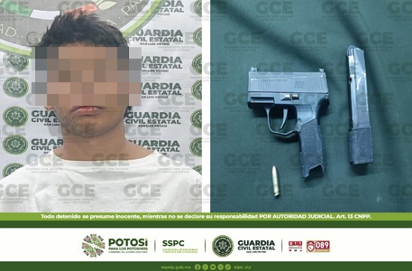 Al presunto, identificado como Miguel “N” de 20 años de edad, se le aseguró un arma de fuego Sig Sauer, tipo escuadra, modelo P365, calibre 9 milímetros, con un cargador y un cartucho útil del mismo calibre.