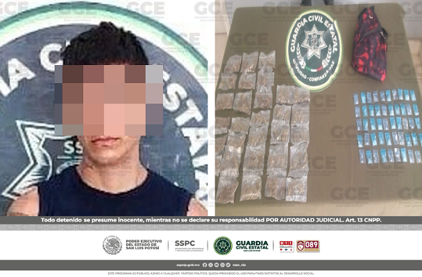 Tamazunchale, S.L.P.- En el marco de las acciones dispuestas dentro del Plan Integral de Seguridad en la región Huasteca para el combate al narcomenudeo, un presunto miembro de la delincuencia fue detenido por agentes de la Guardia Civil Estatal (GCE), luego de asegurarle 70 dosis de narcóticos.