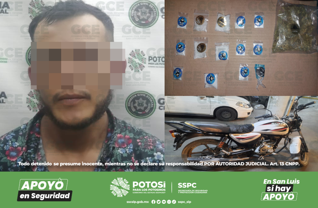 En resultado de los operativos de seguridad que son efectuados para inhibir la comisión de delitos de alto impacto, oficiales de la Guardia Civil Estatal (GCE) detuvieron a un presunto narcomenudista y aseguraron una motocicleta dentro de la cual había “poncha llantas” y estupefacientes.