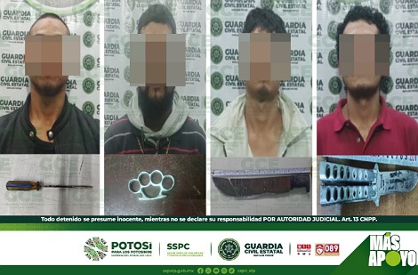 San Luis Potosí, S.L.P.- En diferentes operativos de seguridad, efectuados en la capital potosina por agentes de la Guardia Civil Estatal (GCE), cuatro personas resultaron detenidas, por el presunto delito de portación de armas punzocortantes.