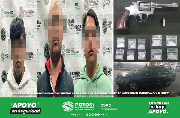 San Luis Potosí, S.L.P.- Los trabajos operativos efectuados para la prevención de hechos delictivos de alto impacto, permitieron que la Guardia Civil Estatal detuviera a tres individuos por la probable portación de un arma de fuego y posesión de droga en la capital potosina.