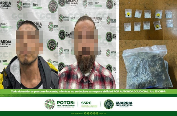 Soledad de Graciano Sánchez, S.L.P.- Oficiales de Guardia Civil Estatal (GCE) detuvieron a dos presuntos integrantes de un grupo criminal, quienes fueron sorprendidos con dosis de marihuana y “cristal” entre sus pertenencias.