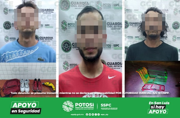 S.L.P.- Las acciones contundentes de seguridad, efectuadas en coordinación con las denuncias ciudadanas, atendidas en el Sistema de Emergencias 911, permitieron la detención de tres hombres por parte de la Guardia Civil Estatal en diferentes acciones, luego de que presumiblemente los presuntos hurtaran enceres de una vivienda y productos de establecimientos comerciales.
