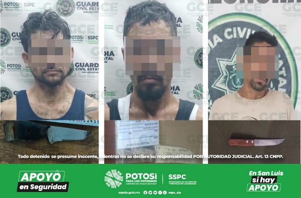 S.L.P.- Recorridos preventivos y disuasivos efectuados por agentes de Guardia Civil Estatal (GCE), permitieron la detención de tres hombres, quienes presumiblemente deambulaban con armas punzocortantes en la capital del estado y en el municipio de Tamazunchale.