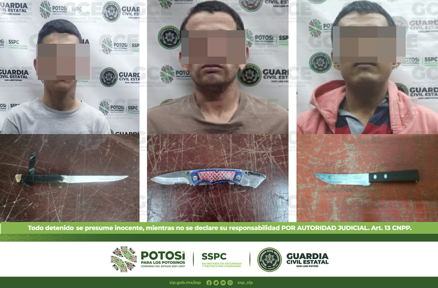 San Luis Potosí, S.L.P.- Como parte de los trabajos de seguridad y prevención implementados por la Guardia Civil Estatal en la capital potosina, tres hombres fueron asegurados por la presunta portación de armas prohibidas.