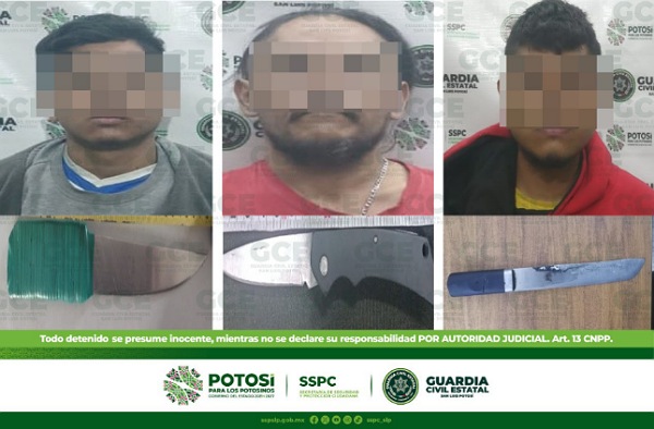 San Luis Potosí, S.L.P.- Mediante los operativos de seguridad y vigilancia, llevados a cabo en la capital potosina, tres individuos fueron sorprendidos en probable posesión de armas prohibidas, lo que derivó que autoridades de Guardia Civil Estatal (GCE) los detuviera.