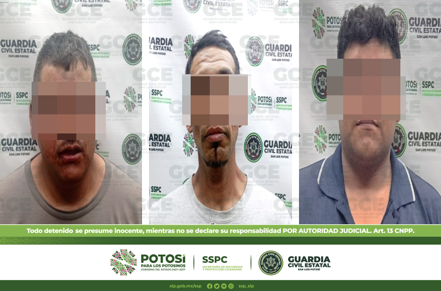 San Luis Potosí, S.L.P.- Como parte de las acciones de seguridad y preventivas que realiza la Guardia Civil Estatal en todo el territorio potosino, se detuvo a tres hombres por la presunta comisión de violencia familiar en la capital potosina.
