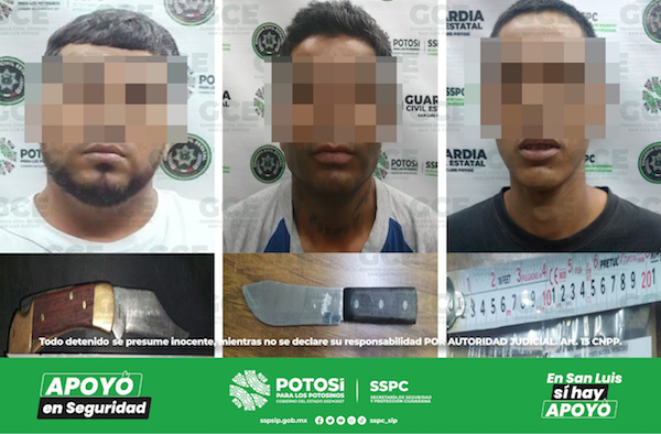 San Luis Potosí, S.L.P.- Durante las acciones de vigilancia que son desdobladas por los diferentes sectores de esta ciudad capital, policías de la Guardia Civil Estatal (GCE) detuvieron a tres individuos, quienes fueron sorprendidos en presunta portación de armas punzocortantes.