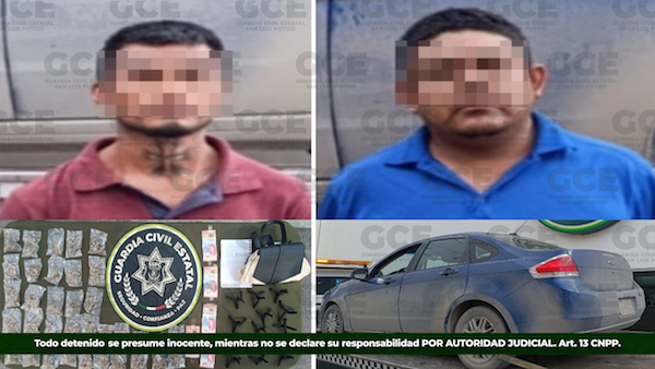 Derivado de acciones permanentes y de los operativos de seguridad y vigilancia en los 59 municipios, la Guardia Civil Estatal (GCE) detuvo en Ciudad Valles a Alfonso “N”, de 29 años, y Víctor “N”, de 27 años, por su presunta responsabilidad en delitos contra la salud.