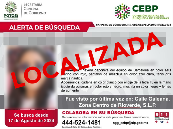 -La menor fue reportada como no localizada el pasado 17 de agosto de 2024, en Ciudad Fernández, siendo ubicada a salvo en el municipio de Rioverde.