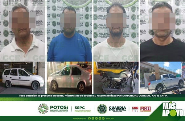 S.L.P.- En el marco de las acciones operativas para el combate de robo de vehículos en la entidad potosina, elementos de Guardia Civil Estatal (GCE) en coordinación con policías especializados del C5i2, lograron la recuperación de ocho vehículos que tenían con reporte de robo, logrando la detención de los presuntos ladrones de estas unidades.