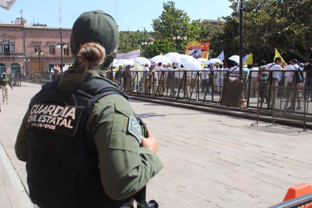 San Luis Potosí, S.L.P.- Esta mañana, agentes de la Guardia Civil Estatal, desplegaron tareas de vigilancia en las inmediaciones de plazas públicas y alrededores del Centro Histórico, con motivo del desfile por el Día del Trabajo.