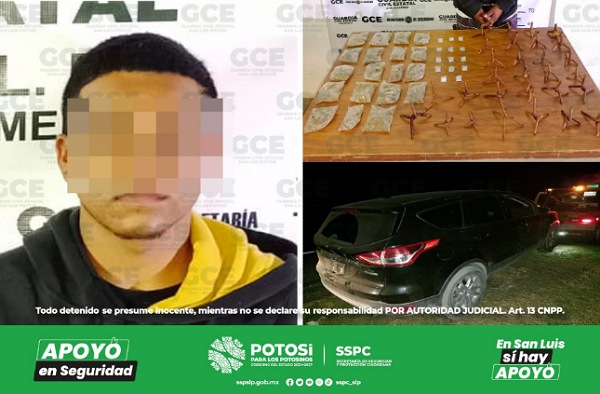 San Luis Potosí.- Elementos de la Guardia Civil Estatal detuvieron a dos presuntos narcomenudistas con la implementación del Plan Integral de Seguridad en las cuatro regiones del estado, logrando recuperar una camioneta robada y asegurar 61 dosis de “cristal”, 19 de marihuana y 29 “ponchallantas”.