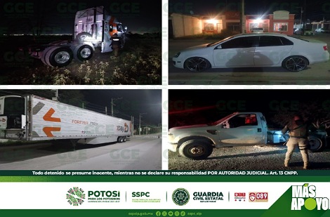 Mediante los operativos en este sector, se ubicó de inmediato la unidad, en donde se auxilió al chofer del tractocamión; un semirremolque tipo caja refrigerado, se ubicó en la comunidad El Zapote, perteneciente al municipio de Soledad de Graciano Sánchez, la cual tenía reporte de robo de la comunidad El Jaralito.