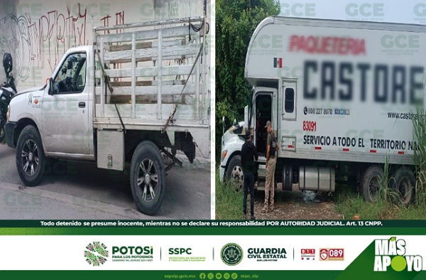 Uno de los sucesos tuvo lugar en el fraccionamiento San José, en Soledad de Graciano Sánchez, se trata de una camioneta marca Nissan, línea Estacas, modelo 2011, con placas de esta Entidad, la cual tenía reporte de robo de la colonia Urbana San Felipe.