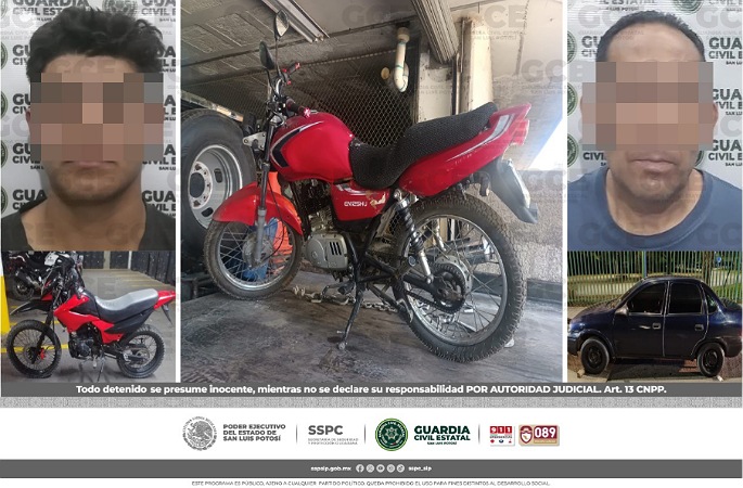 San Luis Potosí, S.L.P.- Agentes de la Guardia Civil Estatal recuperaron un automóvil y una motocicleta con reporte de robo, además de un motor robado luego de las labores de vigilancia y prevención en todo el territorio potosino.