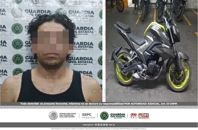 San Luis Potosí, S.L.P.- Como parte de los trabajos preventivos de la Guardia Civil Estatal dentro del operativo Cazador, se logró la recuperación de una motocicleta con reporte de robo en la capital potosina y se detuvo al conductor.