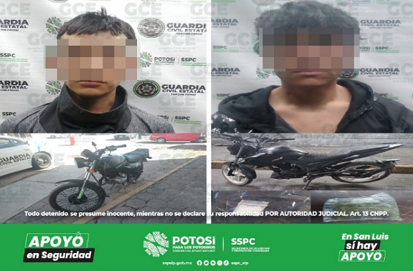 S.L.P.- Gracias al seguimiento de los reportes ciudadanos, atendidos por el Sistema de Emergencias 911, en donde denunciaron el robo de unidades motoras, agentes de Guardia Civil Estatal lograron recuperar tres vehículos y detener a dos presuntos a bordo de motocicletas en este estatus; uno de ellos es reincidente.
