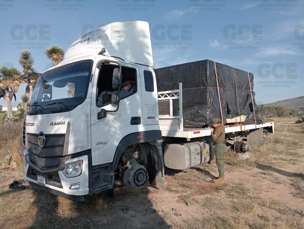 Por su parte, en el municipio de Villa de Arriaga, en un camino de terracería se ubicó un tractocamión color blanco, con las puertas abiertas, en aparente estado de abandono, ahí se encontró el operador de dicha unidad, quien reportó minutos antes lo habían abordado presuntos desconocidos y tras amenazarle lo dejaron abandonado en la unidad. De inmediato se dio aviso a las autoridades de investigación para los trámites correspondientes. Dicho vehículo ya contaba con reporte de robo en el Sistema de Emergencias 911.