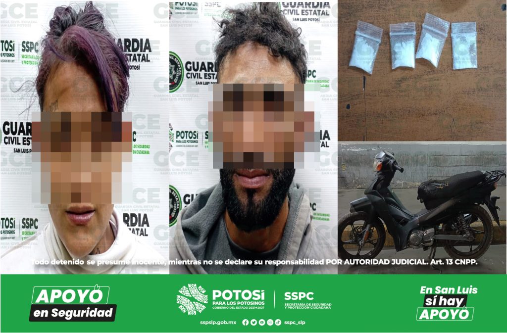 San Luis Potosí, S.L.P.- Dentro de los operativos de prevención y disuasión, elementos de la Guardia Civil Estatal (GCE) detuvieron a una pareja quienes presumiblemente se desplazaban a bordo de una motocicleta que contaba con reporte de robo y tenían además dosis de droga en su poder.