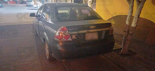 Sobre la avenida Industrias se ubicó un automotor marca Chevrolet, línea Aveo, color negro, modelo 2016, con placas de esta entidad, el cual contaba con reporte de robo del 11 de septiembre de 2023 del fraccionamiento San Jorge, en el municipio de Soledad de Graciano Sánchez.