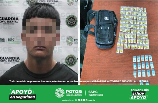 Los hechos ocurrieron durante los patrullajes efectuados en la zona centro de Salinas de Hidalgo, ahí se tuvo contacto con Cristian “N” de 19 años de edad, quien trató de huir de este sector y cambiar su ruta, luego de notar la presencia policial y militar. Luego de una inspección a sus pertenencias, se le aseguraron 92 dosis de la droga sintética conocida como “cristal” y 17 dosis de cocaína.