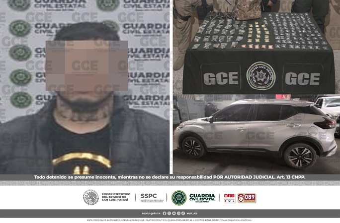 Salinas de Hidalgo, S.L.P.- Como parte del combate sin tregua al narcomenudeo, la Guardia Civil Estatal (GCE) y Ejército mexicano, detuvieron a presunto vendedor de narcóticos, posiblemente relacionado con un grupo criminal, asegurándole entre sus pertenencias 140 dosis de estupefacientes y objetos “poncha llantas”.