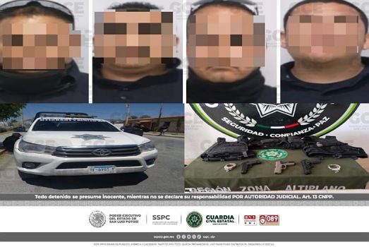 Cedral, S.L.P.- Como resultado de las acciones operativas, desplegadas por Guardia Civil Estatal y SEDENA, cuatro presuntos resultaron detenidos por usurpación de funciones y ejercicio indebido de la función pública; se les aseguró una unidad presuntamente clonada con balizado de Policía Municipal así como equipo táctico y armamento de utilería.