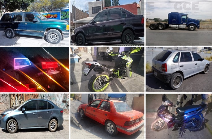 S.L.P.- Derivado de los operativos de búsqueda de unidades con reporte de robo, elementos de la Guardia Civil Estatal (GCE) aseguraron nueve unidades en este estatus, en diferentes puntos de la capital potosina.