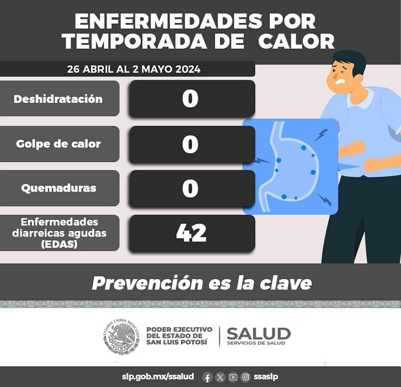 Del 26 de abril al 2 de mayo se registraron 42 casos de personas con enfermedades diarreicas, pero no hay nuevos casos de deshidratación ni de golpe de calor.