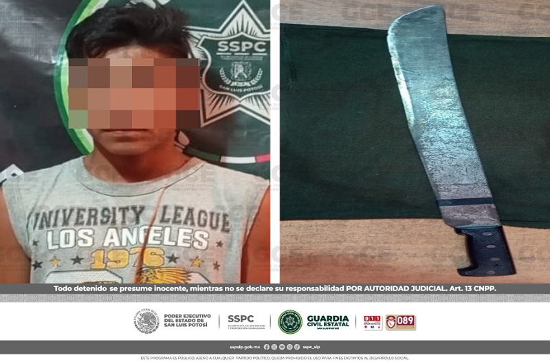 Tanquián de Escobedo, S.L.P.- Mediante una alerta atendida en el Sistema de Emergencias 911, sobre un hombre que presumiblemente amenazó a una persona, las autoridades de la Guardia Civil Estatal (GCE) acudieron en auxilio de la víctima y detuvieron a un hombre, por los presuntos delitos de amenazas y portación de un arma prohibida.